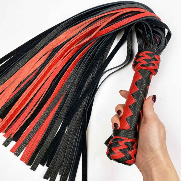 Черно-красный флоггер классический, натуральная кожа, 50 хвостов, по 50см, рукоятка 20см